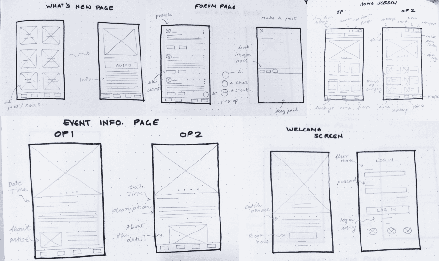 Through empathizing, defining, and ideating, I identified some pain points, which I worked on for creating actions or decisions users might take. I started with creating paper prototypes. I made multiple options for a single screen so I can compare which one works the best.